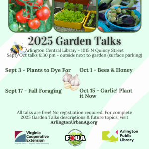 Join us for bi-weekly Garden Talks in 2025! Please note: May 7 – Herbs – Planning, Planting will now meet in Bluemont Room, 2nd floor Arlington Central Library – 1015 N Quincy Street Sponsored by Friends of Urban Agriculture and Extension Master Gardeners Free! No registration required. April-May talks – 6:30 pm – 7:30 pm …